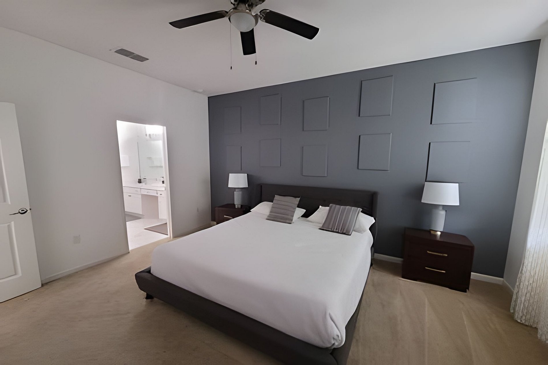 Bedroom 1 - First floor king bed, TV, ceiling fan, en-suite, walk in shower, double sink