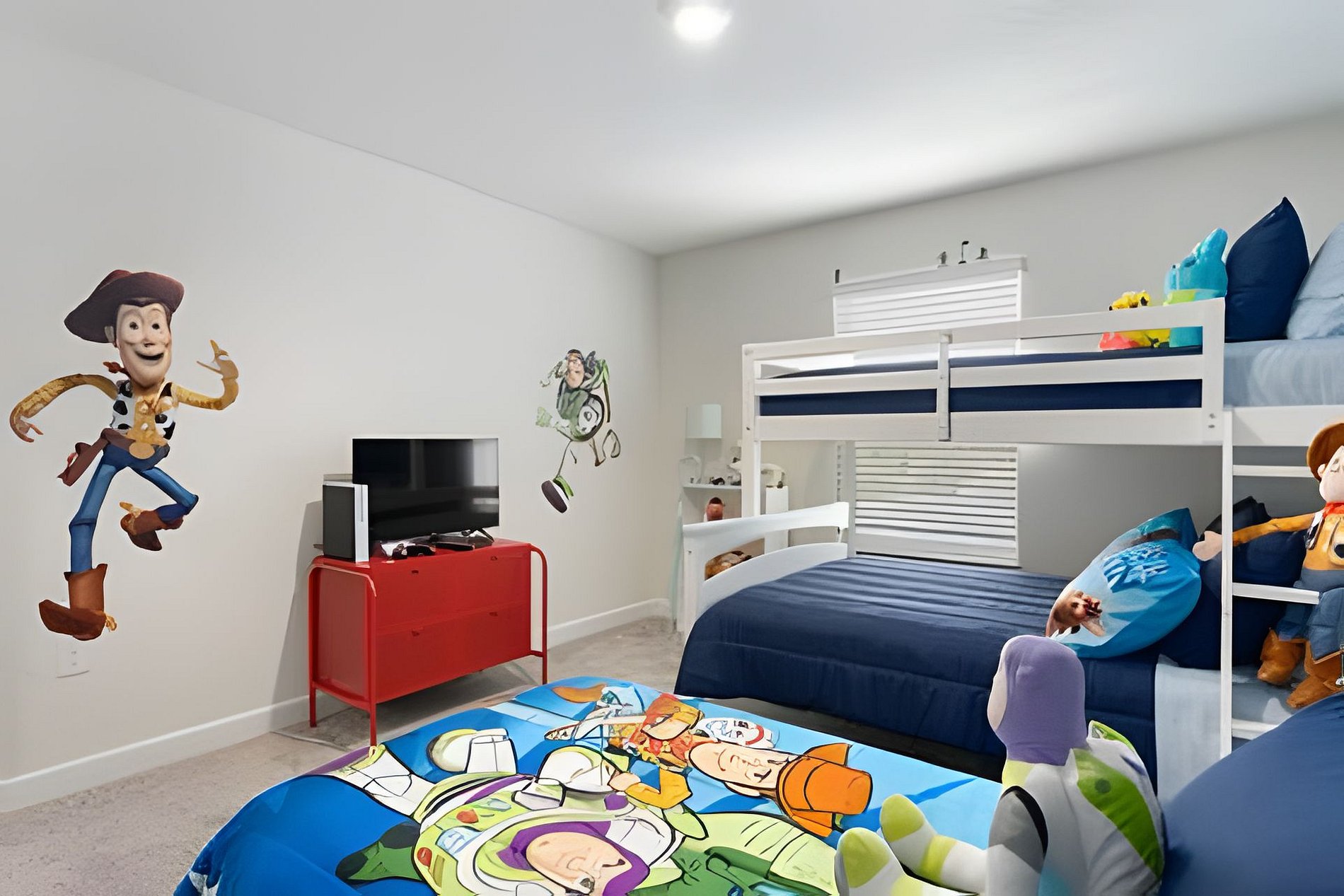 House sleeps 10 plus a baby in a pack & play. We have 4 houses in the Champions Gate Resort. Stunning brand new 4 Bedrooms, 3 Bath private screened pool townhouse in the sought after Champions Gate Resort. Professionally decorated, 4 Flat TV screen, dining table for 06, patio furniture, free wi-fi, cable channels and much more. House Configuration Bedroom 1: King Bed (Downstairs) Bedroom 2: Twin Bed plus a Bunk Bed (Full Below and Twin above). Upstairs Bedroom 3: King Bed (Upstairs) Bedroom 4: King Bed (Upstairs) Other Common Areas: Baby Pack and Play 1 Full Bath Downstairs (walk-in shower), 2 Full Baths Upstairs and one has a walk-in shower . Kitchen, Living Room, Dining is all Downstairs.