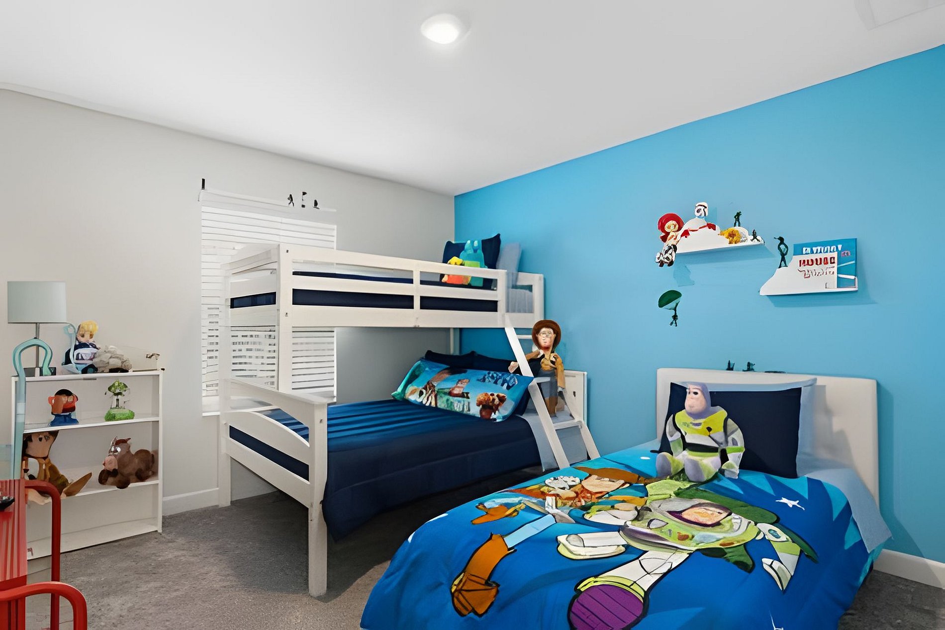 House sleeps 10 plus a baby in a pack & play. We have 4 houses in the Champions Gate Resort. Stunning brand new 4 Bedrooms, 3 Bath private screened pool townhouse in the sought after Champions Gate Resort. Professionally decorated, 4 Flat TV screen, dining table for 06, patio furniture, free wi-fi, cable channels and much more. House Configuration Bedroom 1: King Bed (Downstairs) Bedroom 2: Twin Bed plus a Bunk Bed (Full Below and Twin above). Upstairs Bedroom 3: King Bed (Upstairs) Bedroom 4: King Bed (Upstairs) Other Common Areas: Baby Pack and Play 1 Full Bath Downstairs (walk-in shower), 2 Full Baths Upstairs and one has a walk-in shower . Kitchen, Living Room, Dining is all Downstairs.