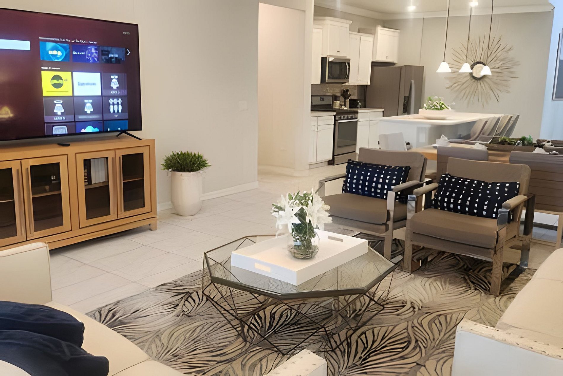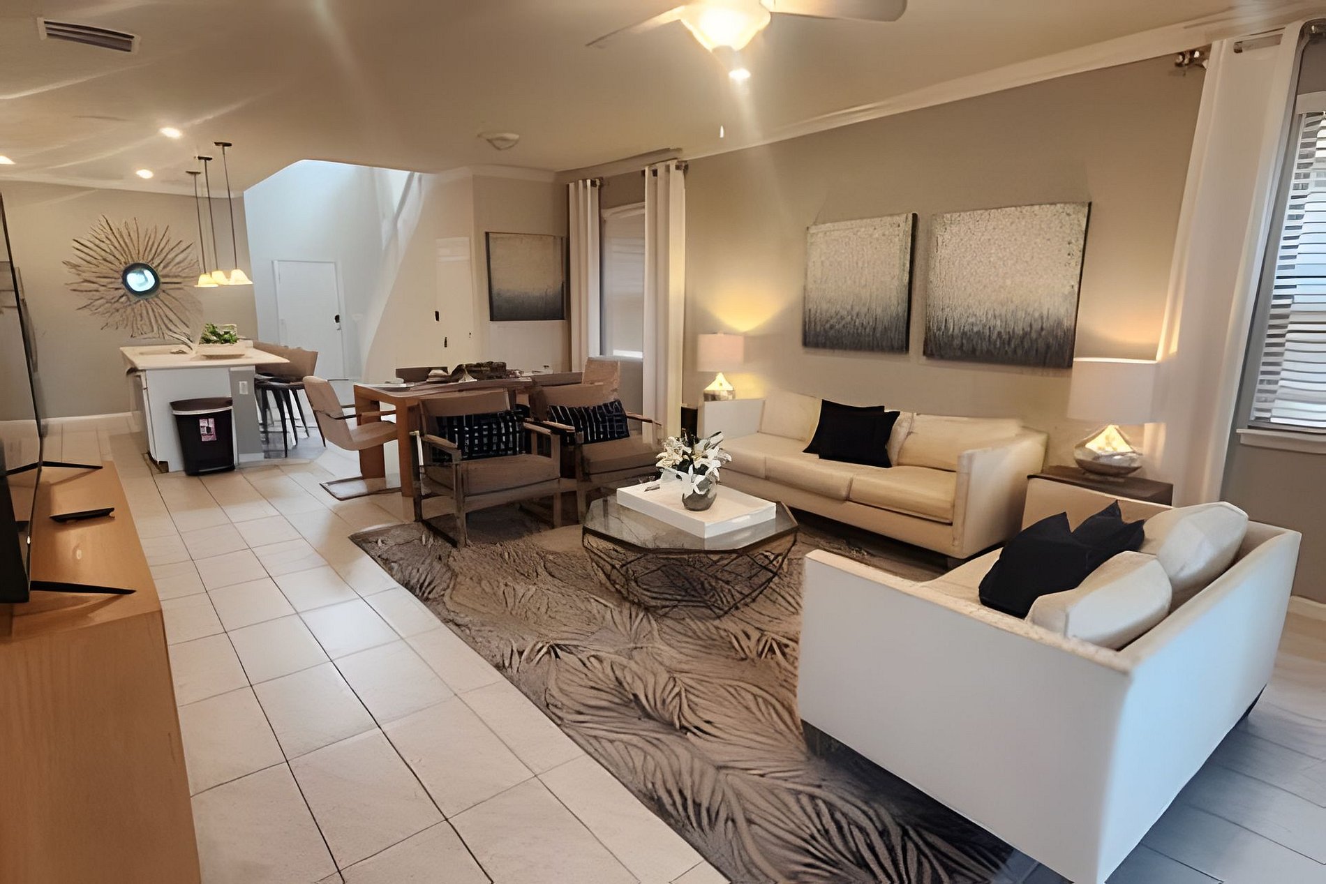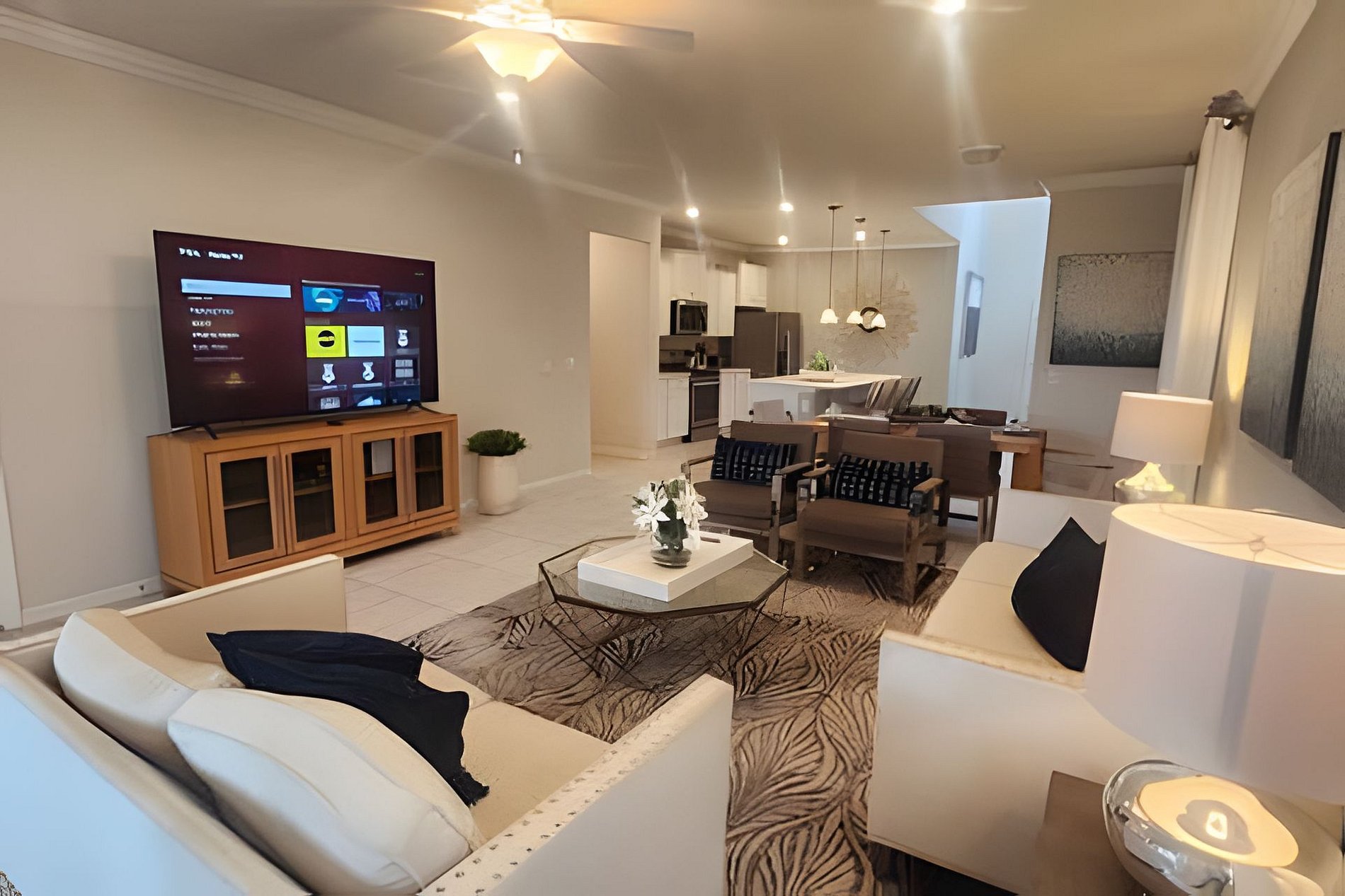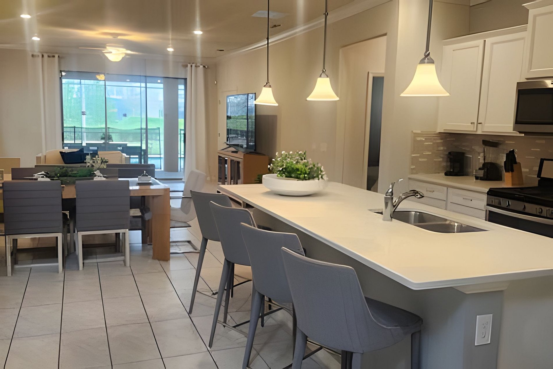 The home has a large living areas downstairs for your group. A large open concept living area downstairs to gather the family awaits you. A beautiful dining area with seating for 6 and large fully equipped kitchen with granite counter tops and stainless steel appliances. A breakfast bar at the kitchen Island has seating for 4 more guests. There is a large screen Roku TV in the living Room/kitchen combo area.There is also a lounge area upstrairs with a large Roku TV to watch your favorite movies and relax after a long day at the parks. In the garage we have a Basketball Game.