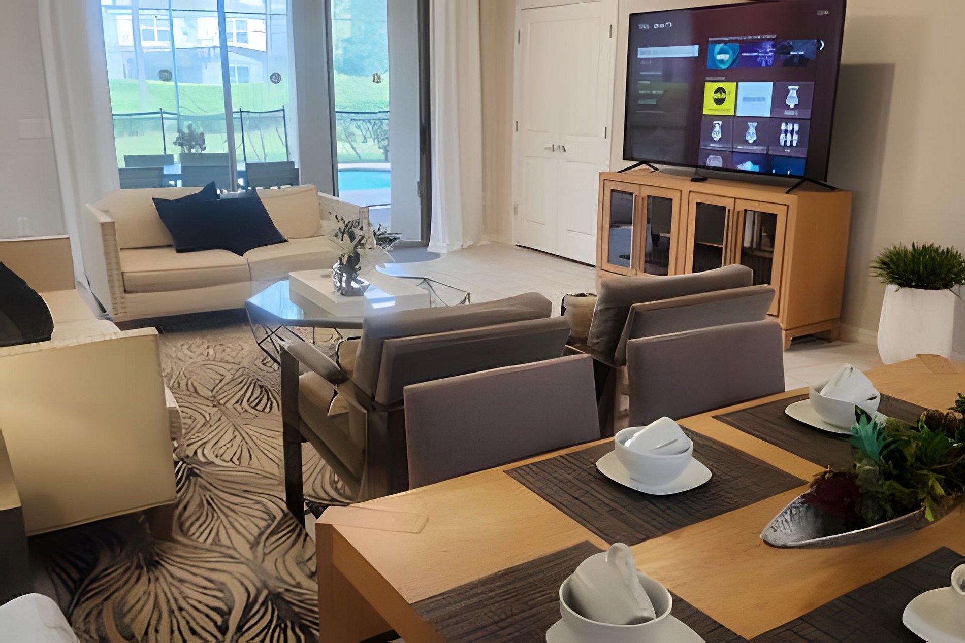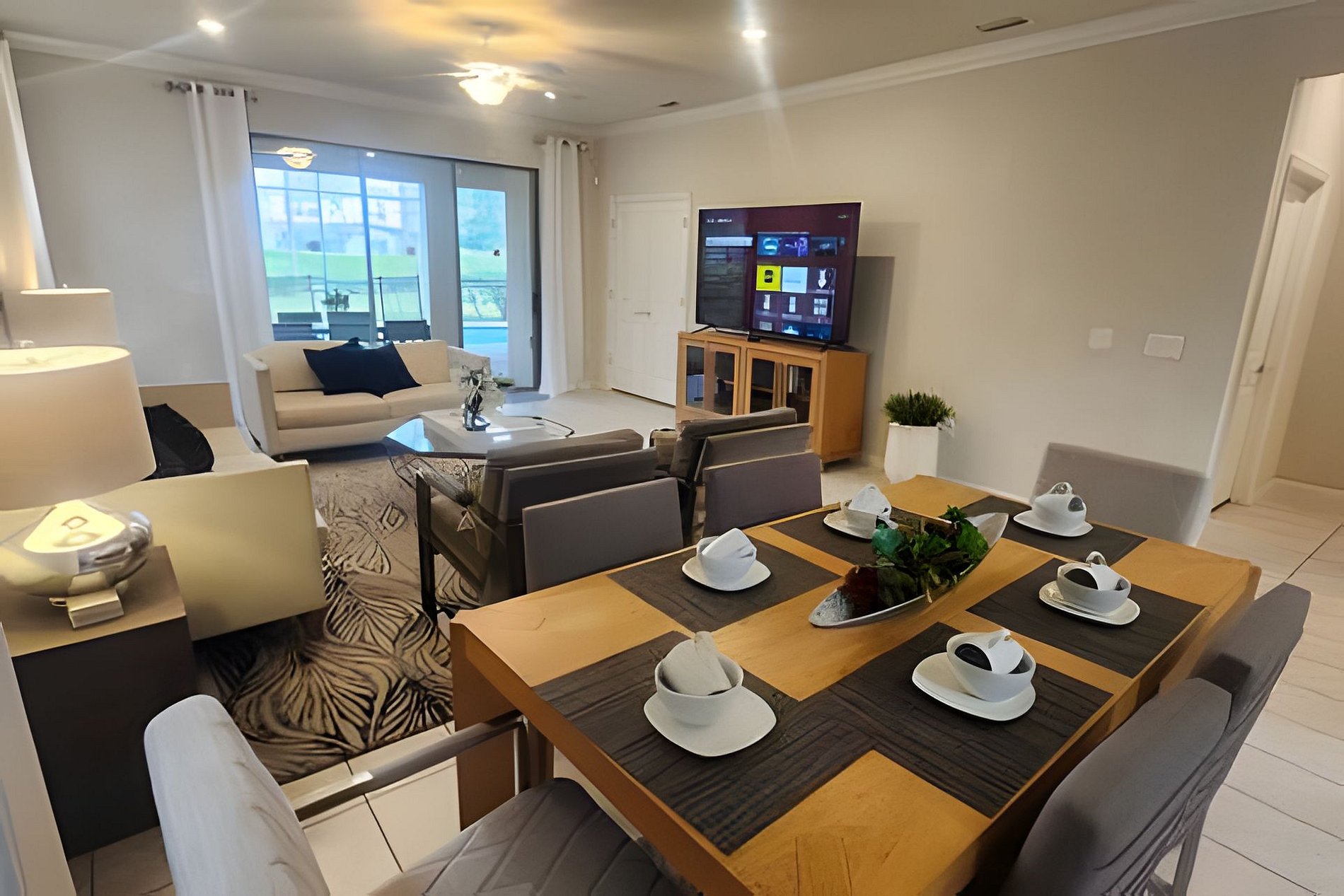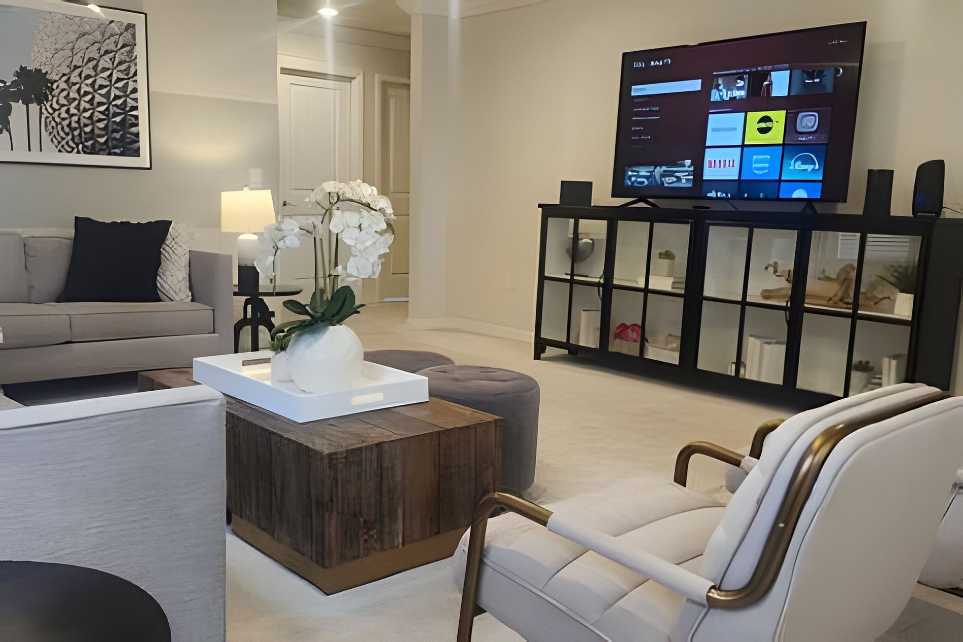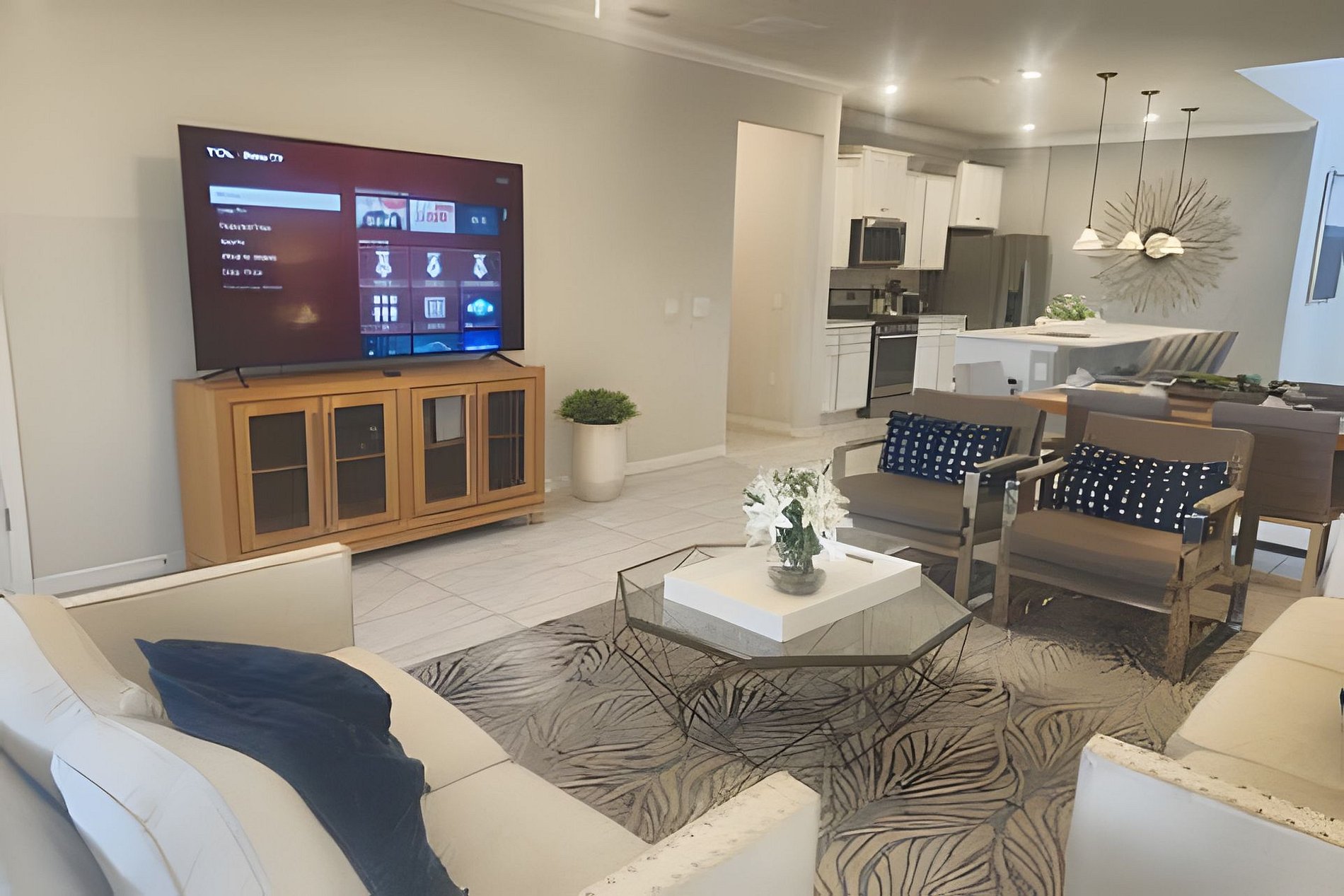 The home has a large living areas downstairs for your group. A large open concept living area downstairs to gather the family awaits you. A beautiful dining area with seating for 6 and large fully equipped kitchen with granite counter tops and stainless steel appliances. A breakfast bar at the kitchen Island has seating for 4 more guests. There is a large screen Roku TV in the living Room/kitchen combo area.There is also a lounge area upstrairs with a large Roku TV to watch your favorite movies and relax after a long day at the parks. In the garage we have a Basketball Game.