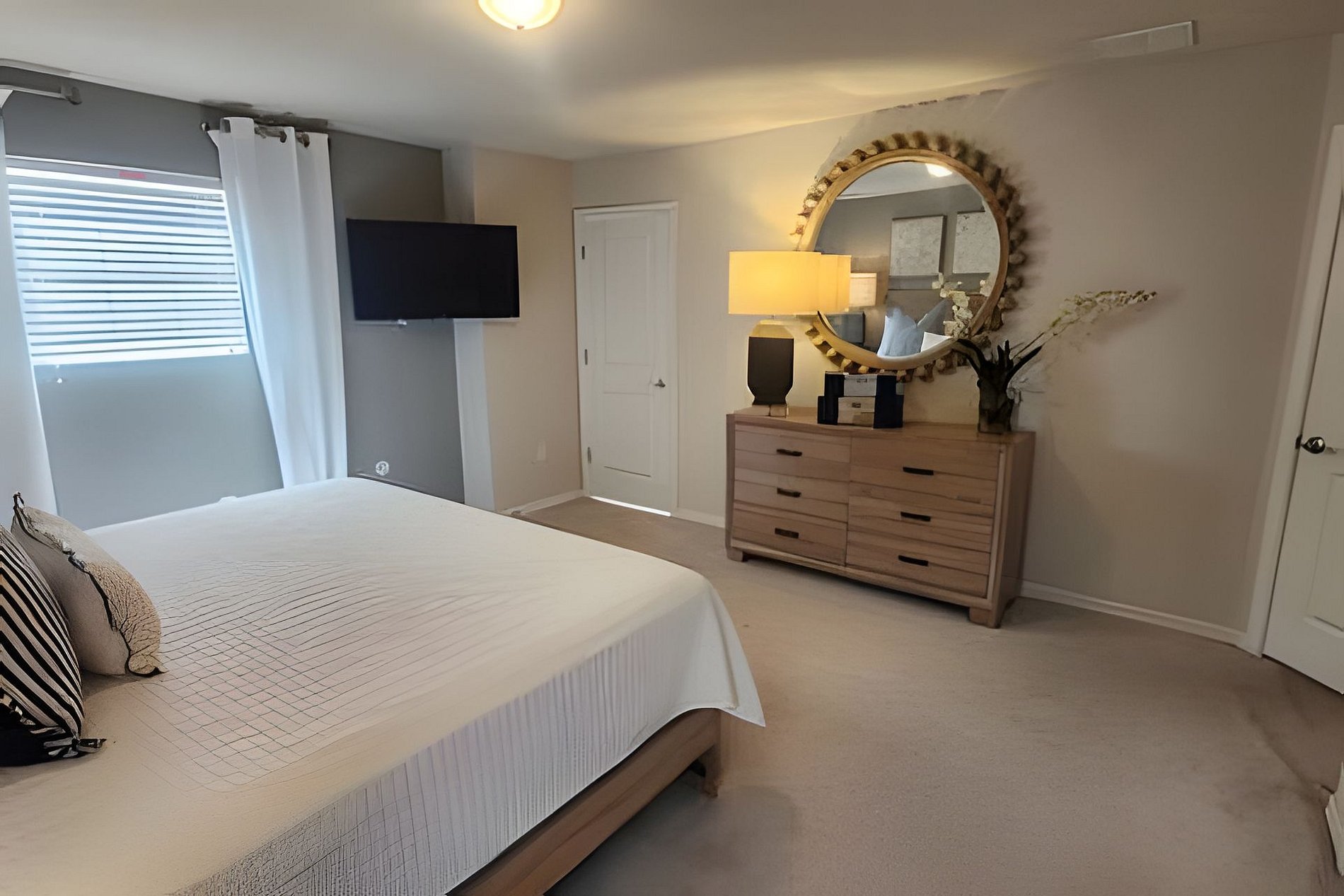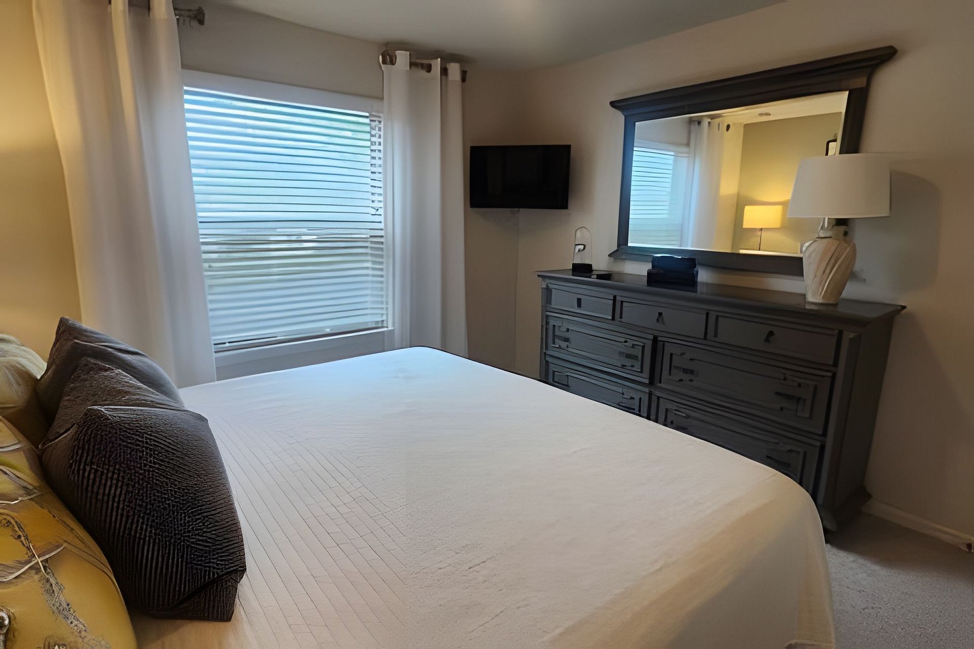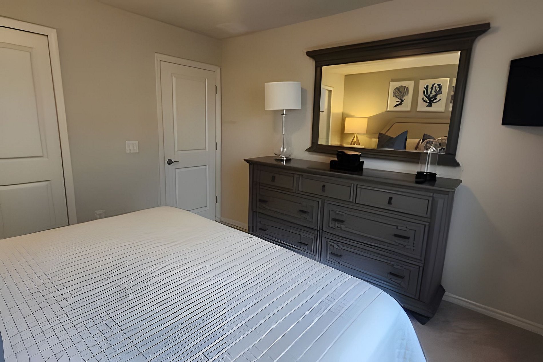 Bedroom 1: 1 King Bed, Roku TV, Dresser, Ensuite wit bathtub, double vanities, walk-in shower. This bathroom give you access to the pool area (Downstairs)
