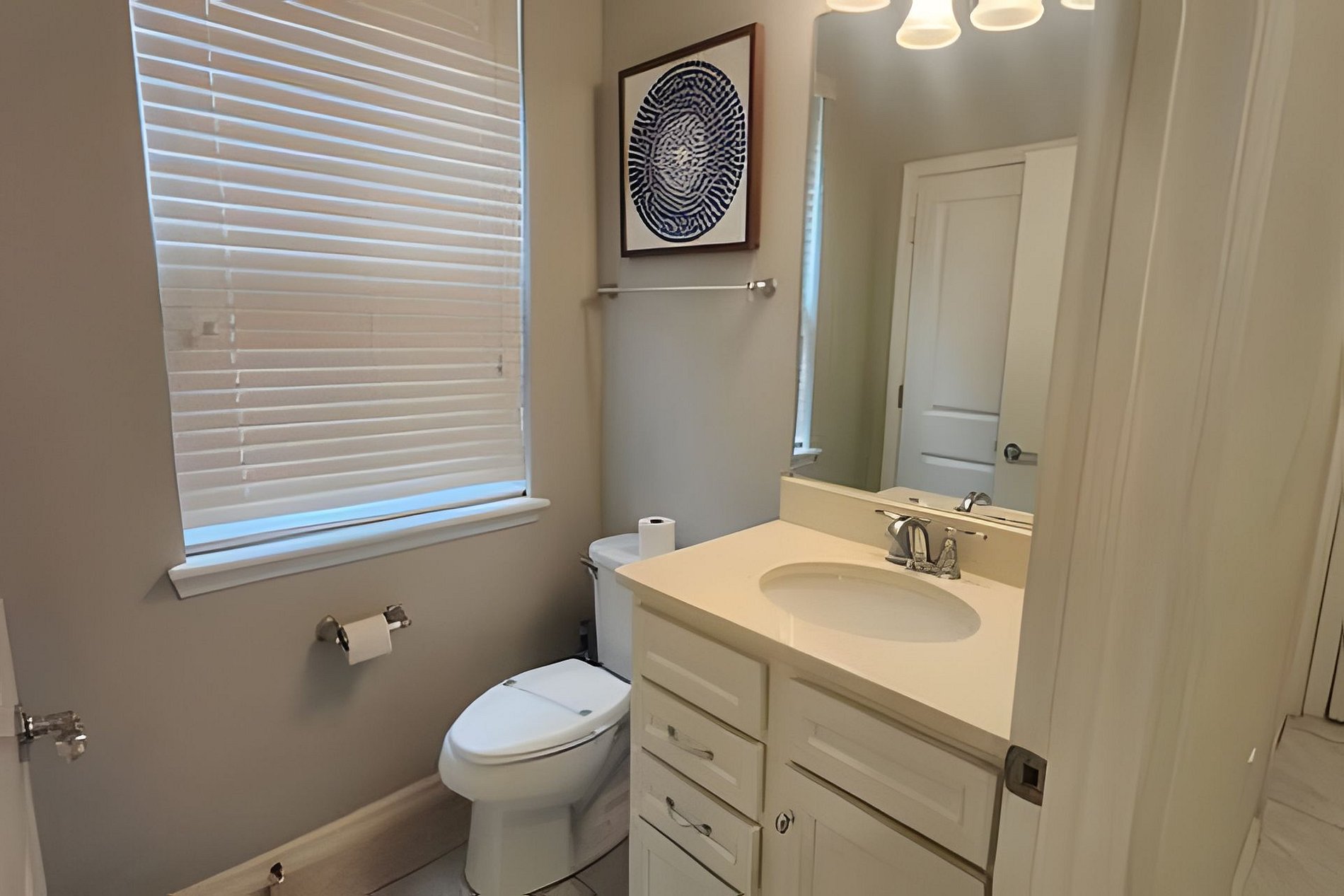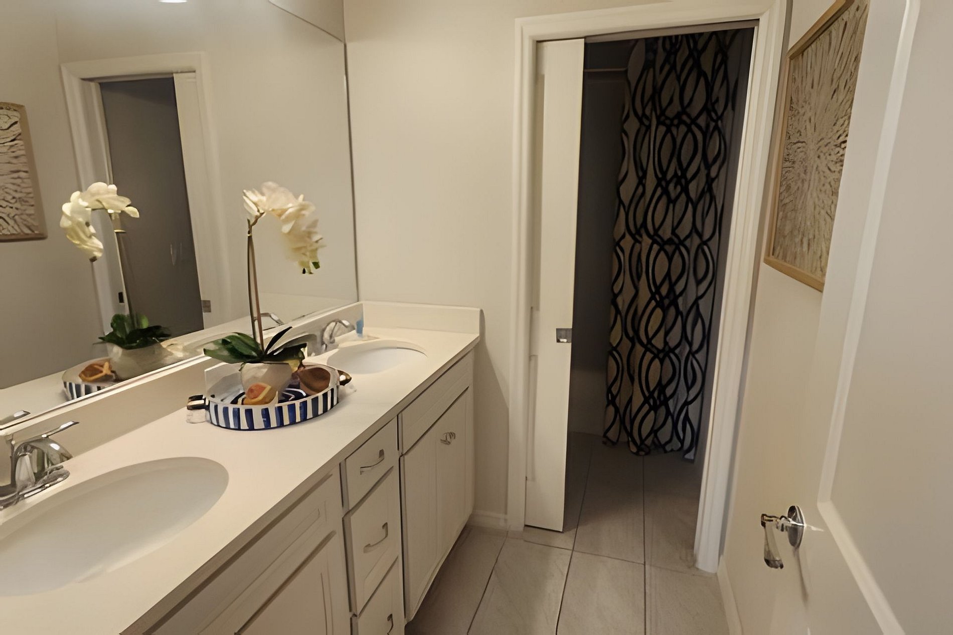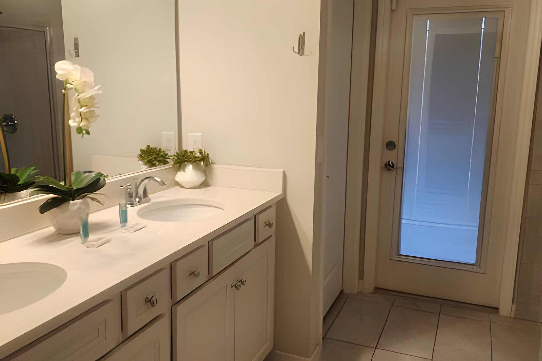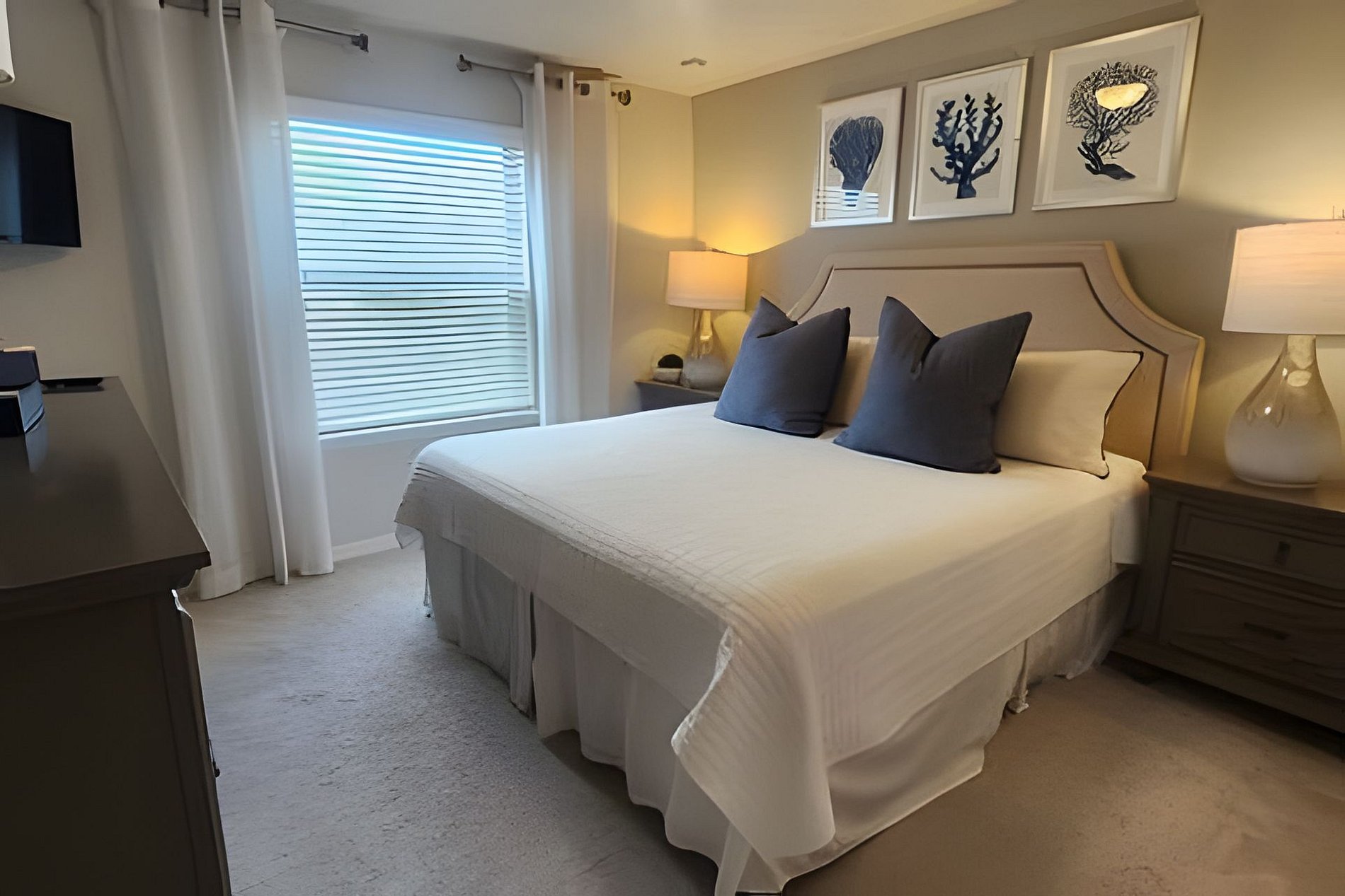 Bedroom 1: 1 King Bed, Roku TV, Dresser, Ensuite wit bathtub, double vanities, walk-in shower. This bathroom give you access to the pool area (Downstairs)