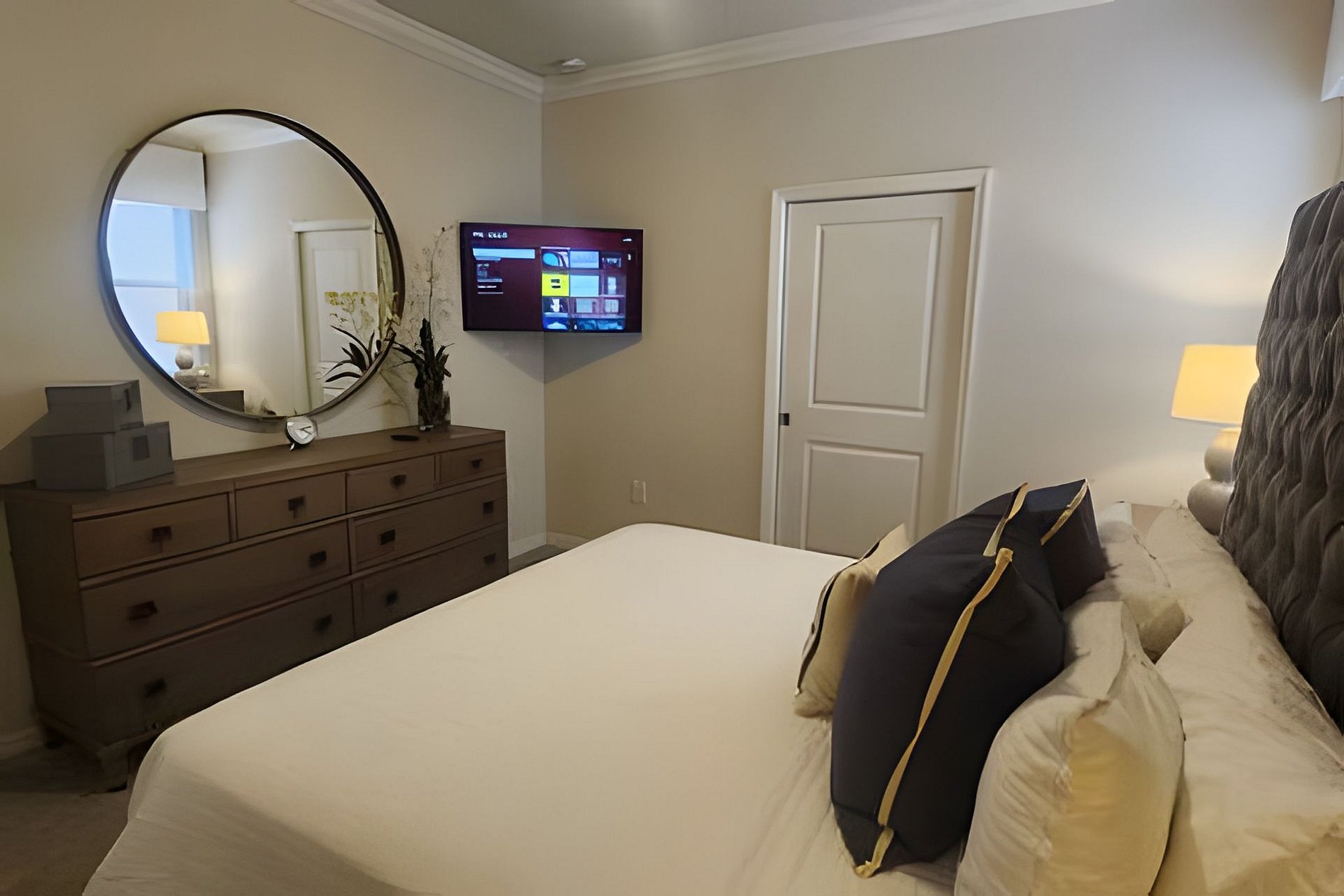 Bedroom 1: 1 King Bed, Roku TV, Dresser, Ensuite wit bathtub, double vanities, walk-in shower. This bathroom give you access to the pool area (Downstairs)