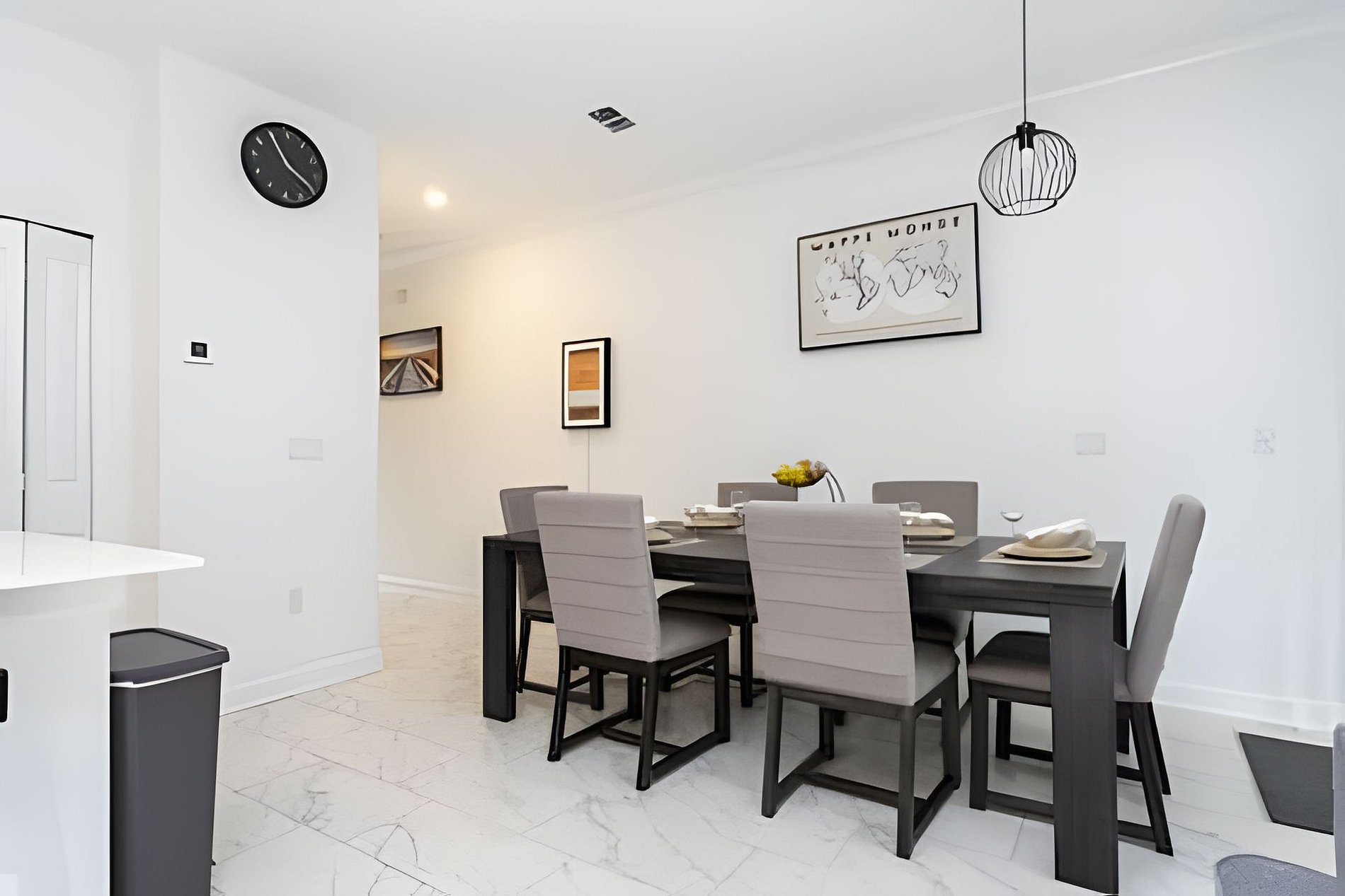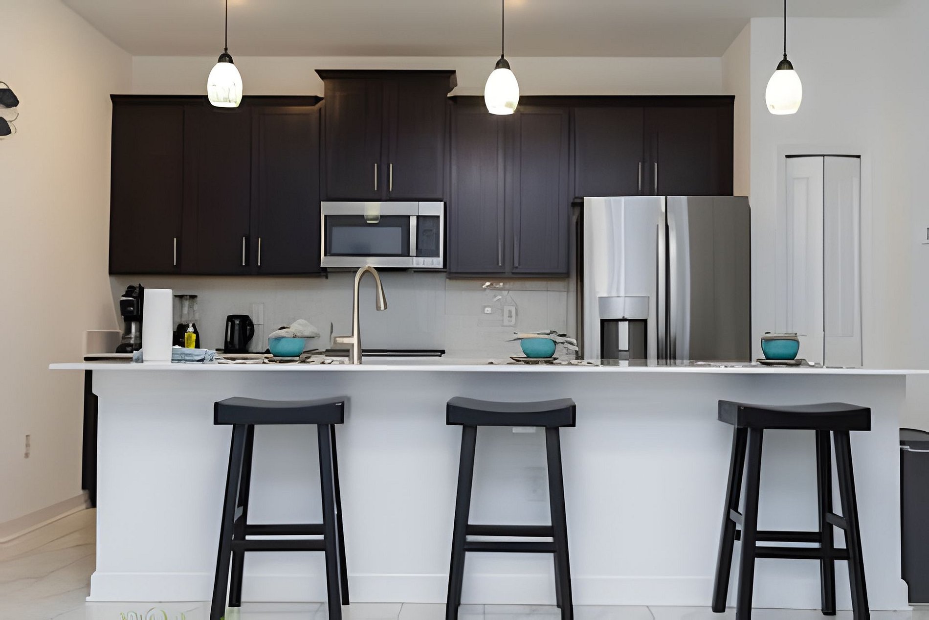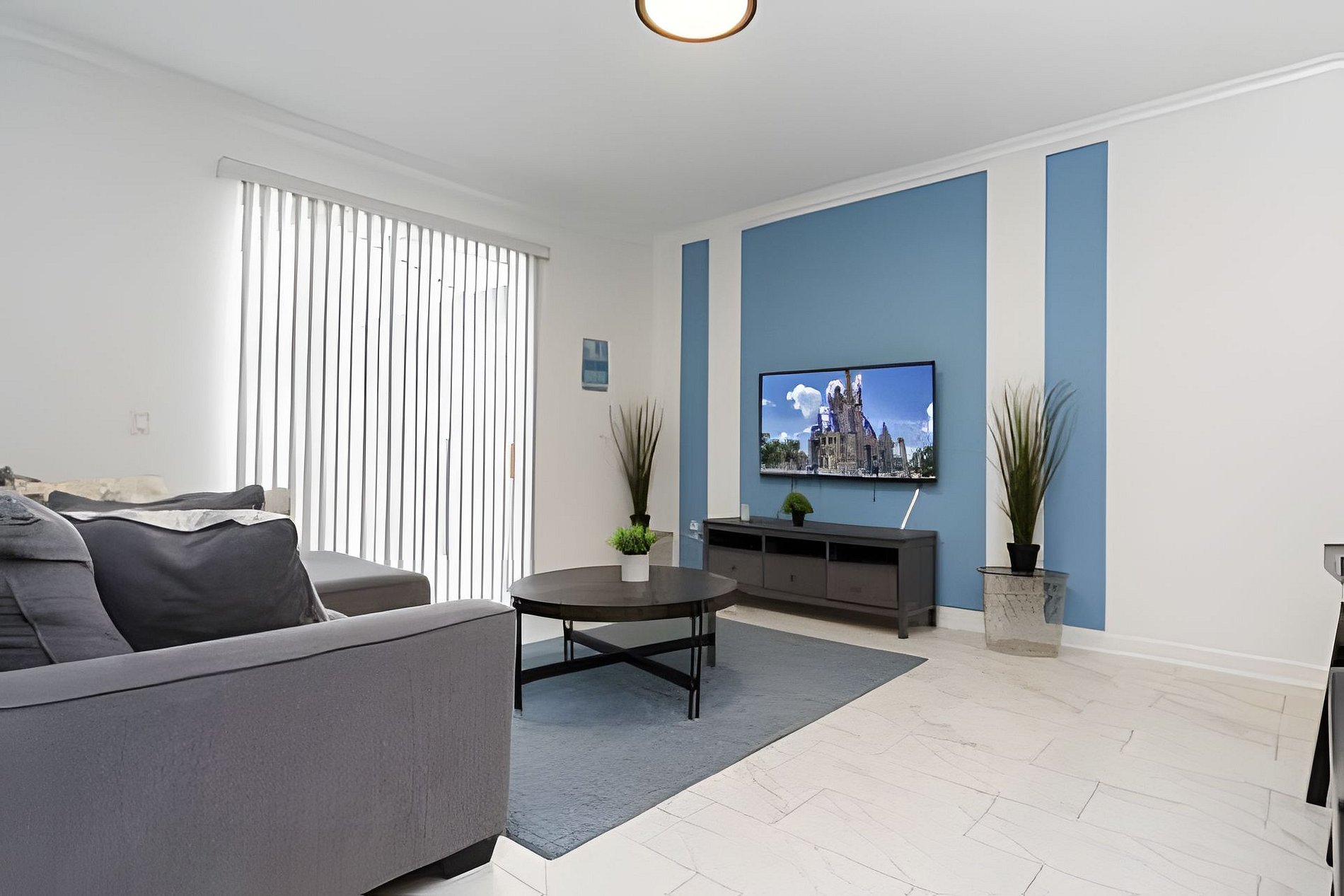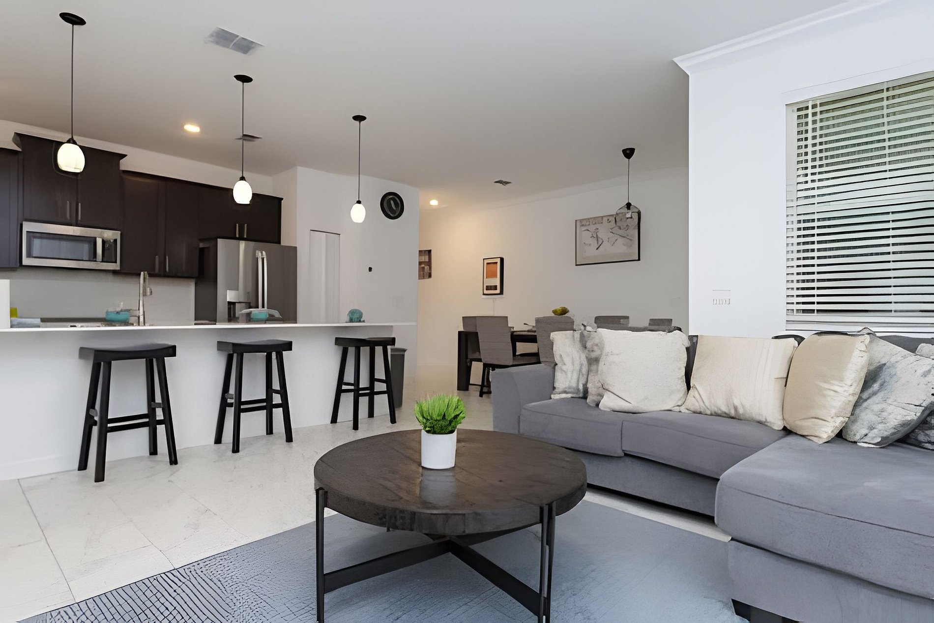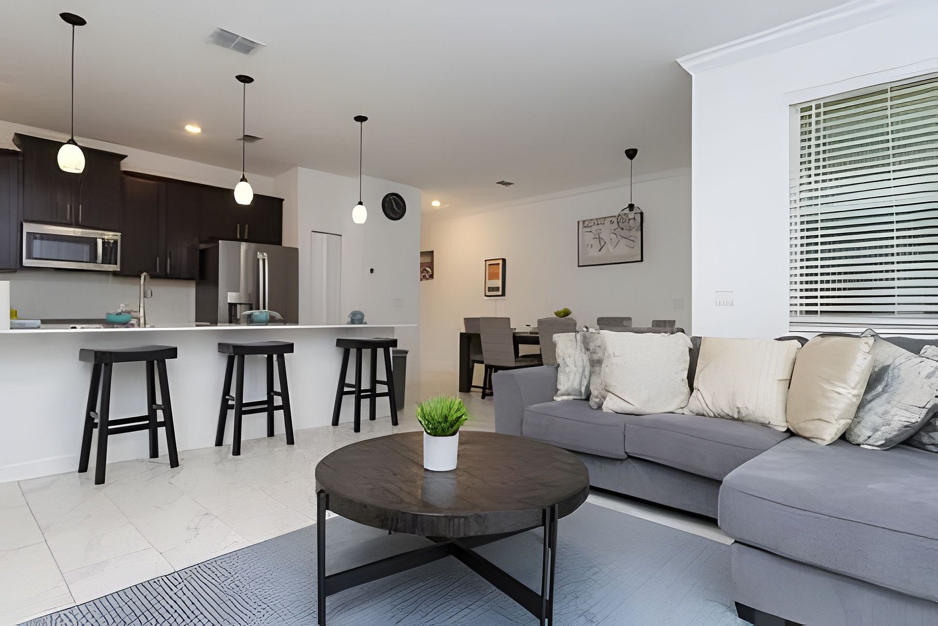 Relax in Style: The open-plan living room invites relaxation with cozy seating and a large TV for family movie nights. The fully equipped kitchen boasts stainless steel appliances, granite countertops, and all essentials for cooking. Dine at the stylish table or enjoy meals by the poolside.