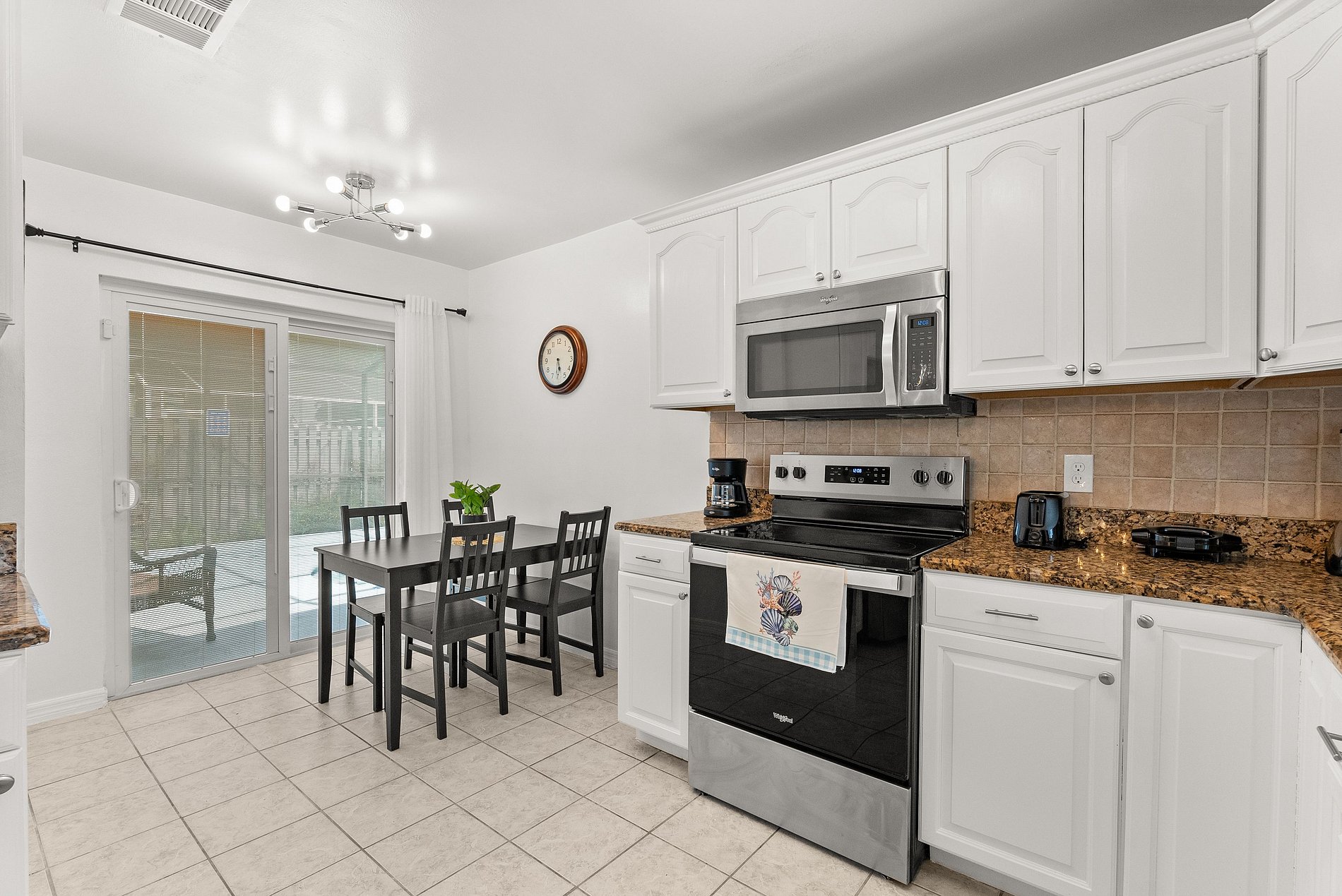 Relax in the spacious living area with vaulted ceilings and a large TV with streaming services. The dining area seats six, with an additional cozy nook for four. The fully-equipped kitchen includes modern appliances, perfect for preparing meals during your stay.