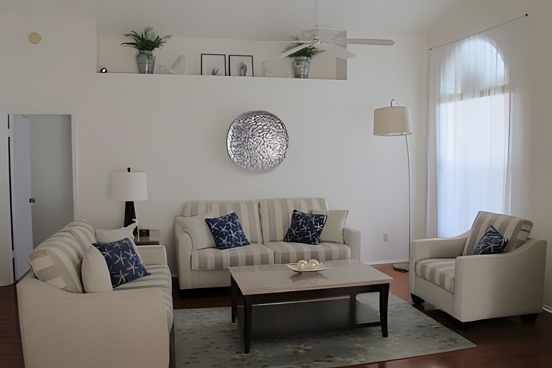 The spacious air-conditioned vacation villa has a vaulted ceiling, is very homely, with tiled living areas and carpet in the bedrooms. Houe is fully furnished. With a big television (streaming only: Free Live TV Channels, Peacock with free movies or you can stream your own subscriptions such as Netflix, Hulu, Prime, etc...) in the Living Room.