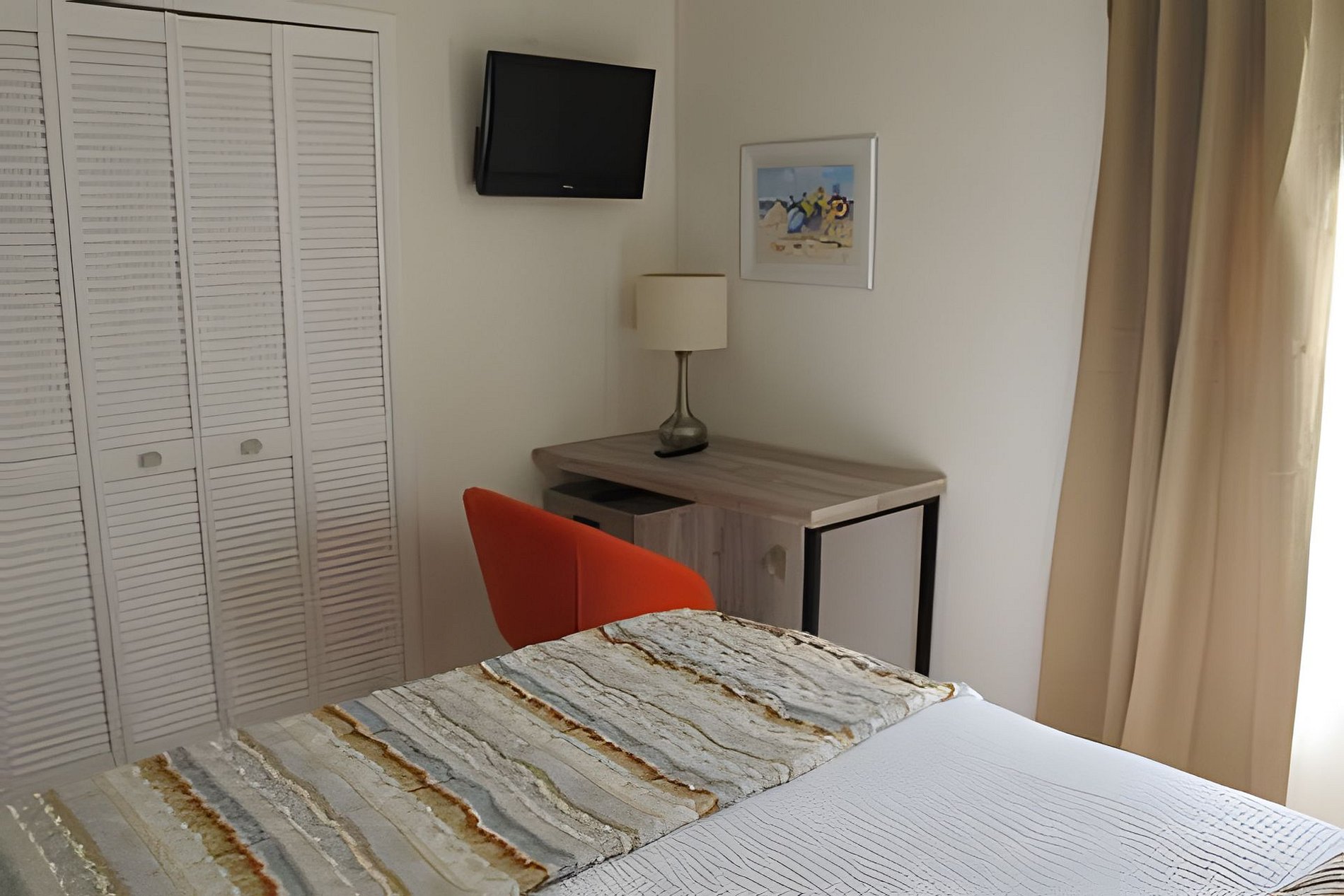 The elegantly furnished master bedroom overlooks the pool and has a huge king size bed, lamps, ceiling fan, and television (Roku TV : Streaming only including live TV Channels). There is a large walk-in closet for hanging clothes, along with separate cupboard and drawer space. The en-suite bathroom contains a walk-in shower, WC, dual-sink, hairdryer and space for those essential holiday lotions and toiletries.