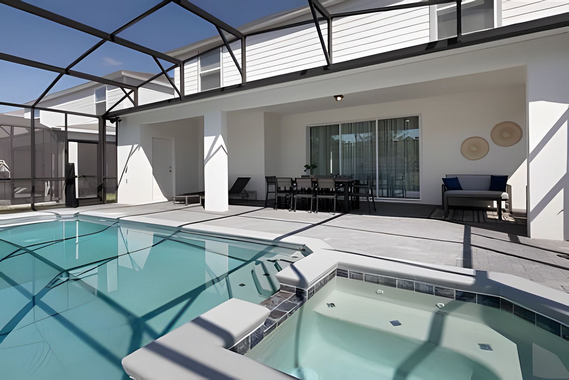 The fully equipped kitchen features everything you need to create the greatest meals on your magical vacation with kitchen barstool seating, perfect for the whole family. Look over to your right and you'll notice a welcoming dining room space. This area offers seating for 12, with plenty of room for the family to dine at any time of day. The modern-designed gathering room is perfect for lounging after a fun day at the parks with plenty of spacious seating, sectional and a large SMART TV to watch your favorite movies and TV shows on. Don't just admire the view from the living area of your spectacular private screened-in pool deck, become immersed in it as soon as you step past the sliding doors.