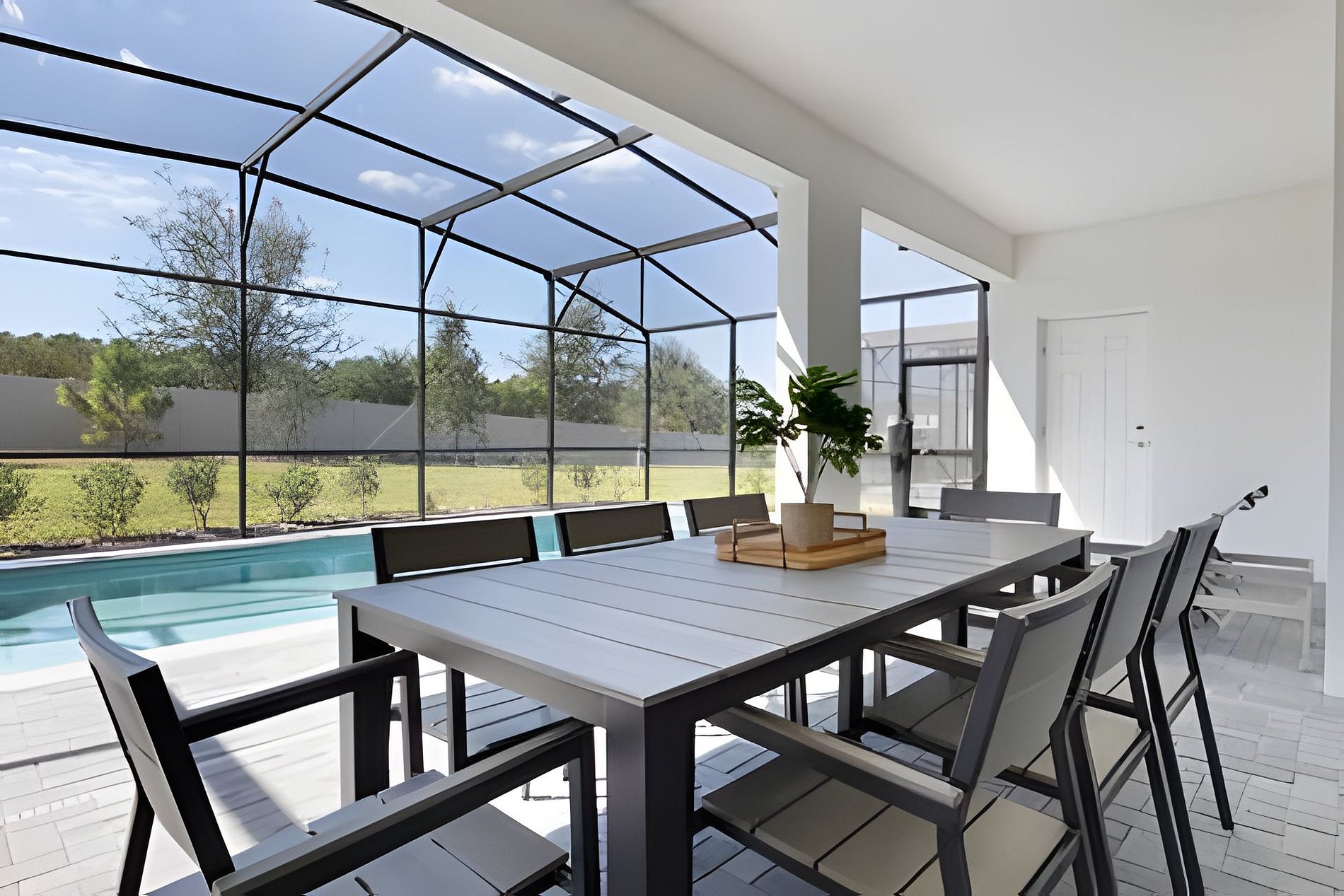 The fully equipped kitchen features everything you need to create the greatest meals on your magical vacation with kitchen barstool seating, perfect for the whole family. Look over to your right and you'll notice a welcoming dining room space. This area offers seating for 12, with plenty of room for the family to dine at any time of day. The modern-designed gathering room is perfect for lounging after a fun day at the parks with plenty of spacious seating, sectional and a large SMART TV to watch your favorite movies and TV shows on. Don't just admire the view from the living area of your spectacular private screened-in pool deck, become immersed in it as soon as you step past the sliding doors.