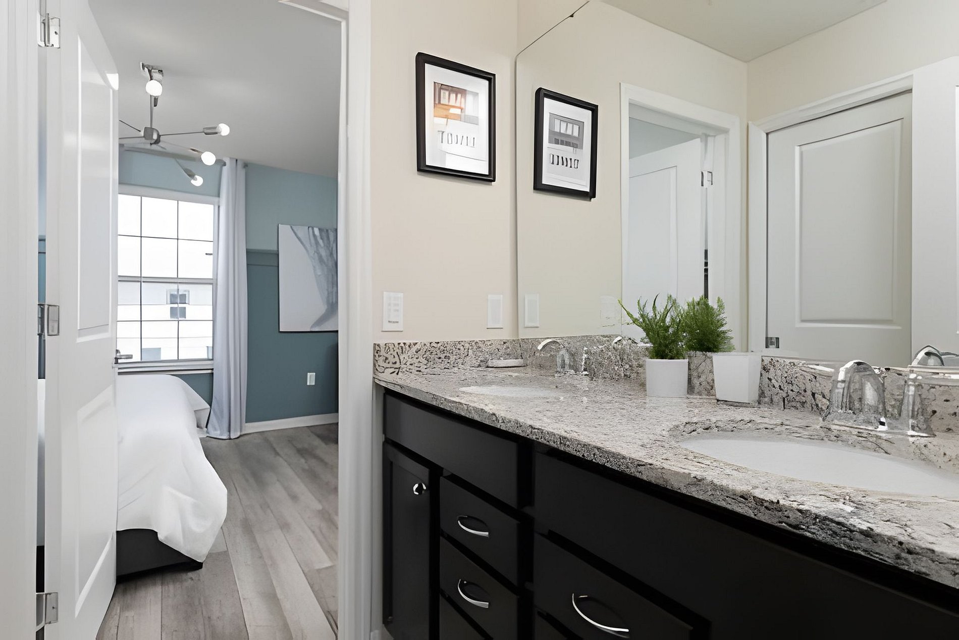 Bedroom 1: King Bed, En-Suite, Bathtub, Walk-In Shower. Double Sink, TV (Downstairs)