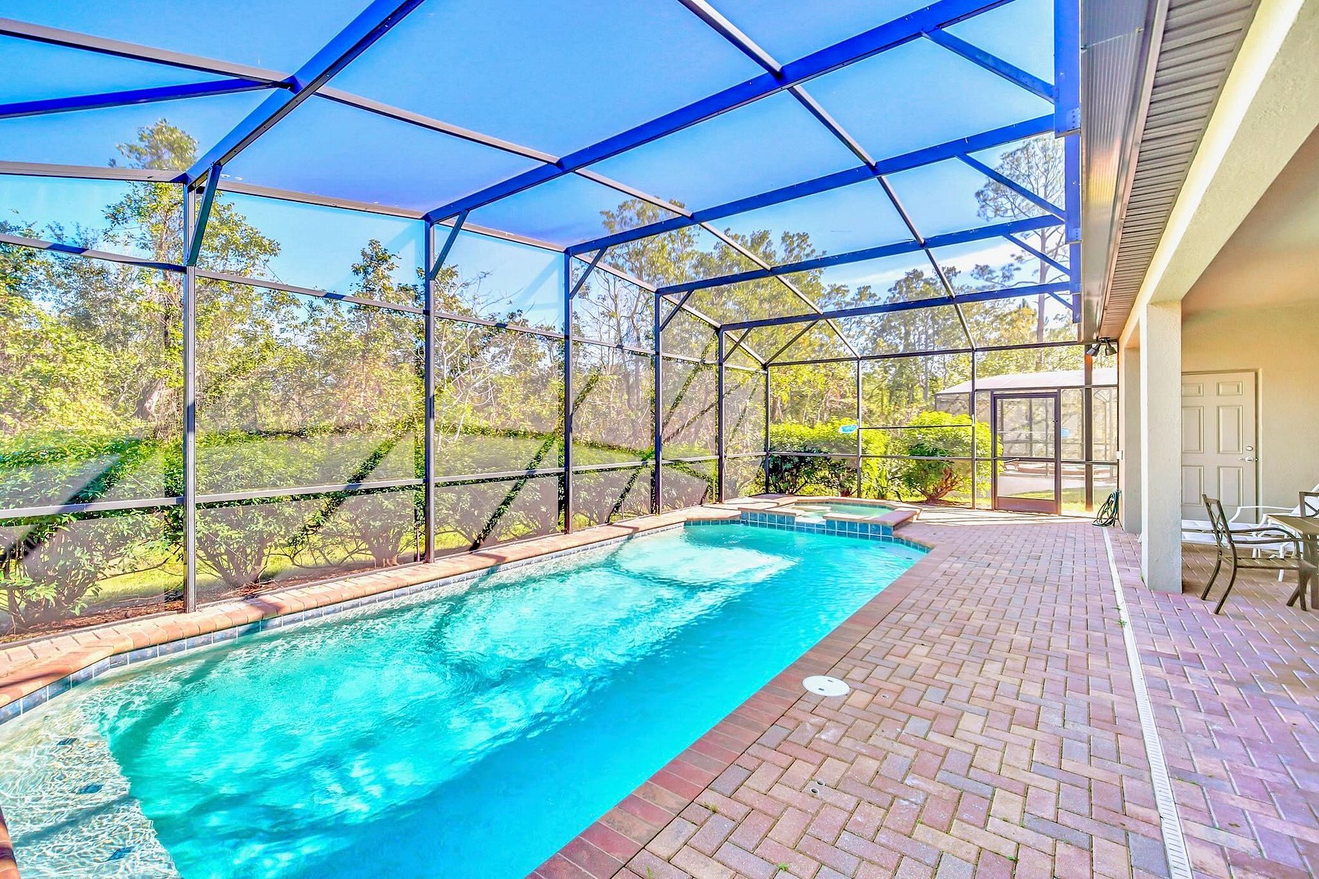 Os hóspedes desfrutam de acomodações amplas e confortáveis, geralmente com áreas integradas, cozinha totalmente equipada, piscina privativa com tela de proteção e múltiplos quartos perfeitos para grupos grandes.